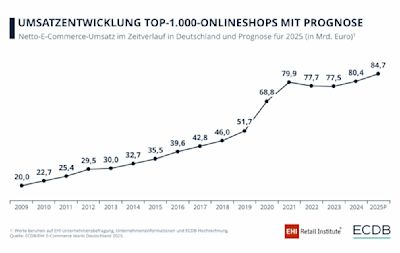Auch der Gesamtmarkt zeigt sich wieder stärker. Der Netto-E-Commerce-Umsatz der Top-1.000 Onlineshops lag 2024 bei €80,4 Mrd. – ein Plus von 3,8 % im Vergleich zum Vorjahr. Nach der Stagnation der letzten Jahre hat sich der Markt damit stabilisiert. Für 2025 erwartet das EHI ein weiteres Wachstum von 5,3 %.
